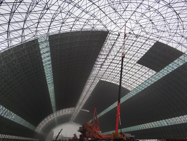 省港务集团成立后贯彻落实“生态优先、绿色发展”理念,积极实施港口提质改造,切实履行企业环保责任。作为城陵矶港环保提质改造最主要的建设项目,该螺栓球钢网架大棚由33456根杆件、8258个连接球拼接而成,长470米、高46.5米、单跨经110米,为湖南省单跨径最大、高度最高,长江流域首个巨型“胶囊”式散货大棚。为了加快项目施工进度,省港务集团与施工方积极配合,全力以赴,克服工期短、时间紧、难度大、任务重等诸多困难以及不利天气影响,保质保量保安全,推动各大小节点目标有序实现。