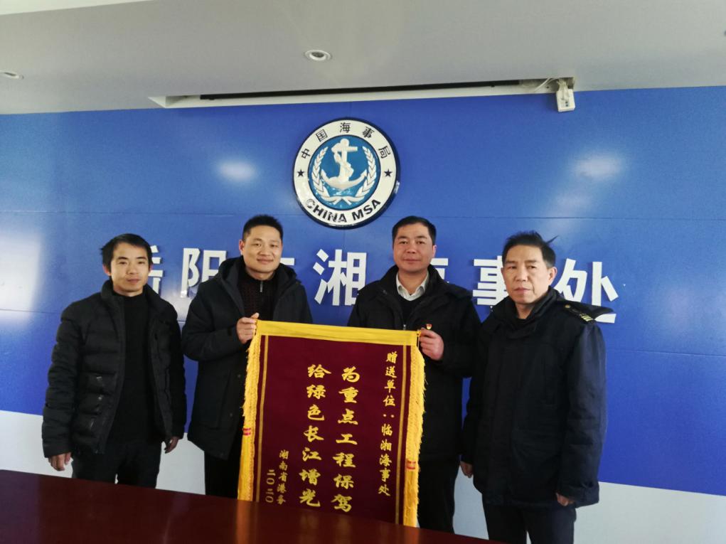 “你们放弃休息时间为洗舱站项目建设服务,你们敬业、认真、高效的工作给了我们很大的支持!”1月13日下午,受省港务集团委托,岳阳绿色航运环保公司董事长黎岳锋向临湘海事处党支部书记、处长权志鹏送上了一面锦旗,感谢该处“为重点工程保驾护航、给绿色长江增光添彩”。