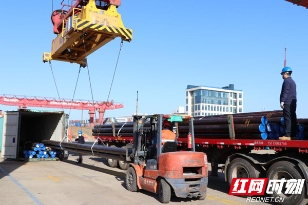 湖南远洋出口钢管现场装箱。