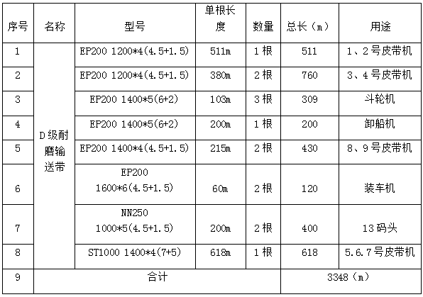 2.1 项目概况:本采购项目位于湖南省岳阳市城陵矶港区,岳阳城陵矶港务有限责任公司环保提质改造项目带式输送机系统已连续投入使用2年,多处输送带已破损,严重影响带式输送机系统安全正常运行,急需采购维修更换,消除设备运行安全隐患。此次采购选用D级耐磨输送带,请投标人注意确保产品符合技术要求。
