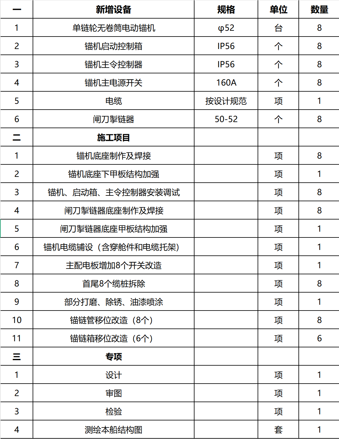 2.4 招标范围及相应计划工期:为消除设备本质安全隐患,决定对#13码头趸船的首、尾锚泊设备技术改造,为趸船8套锚链分别配备一台电动锚机、设制动装置,实现每套锚链独立、傻瓜式单人操作。
