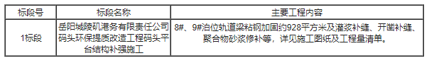 2.2本次招标范围为岳阳城陵矶港务有限责任公司码头环保提质改造工程8#、9#泊位码头平台结构补强施工,分为1个标段,其主要工程内容见下表: