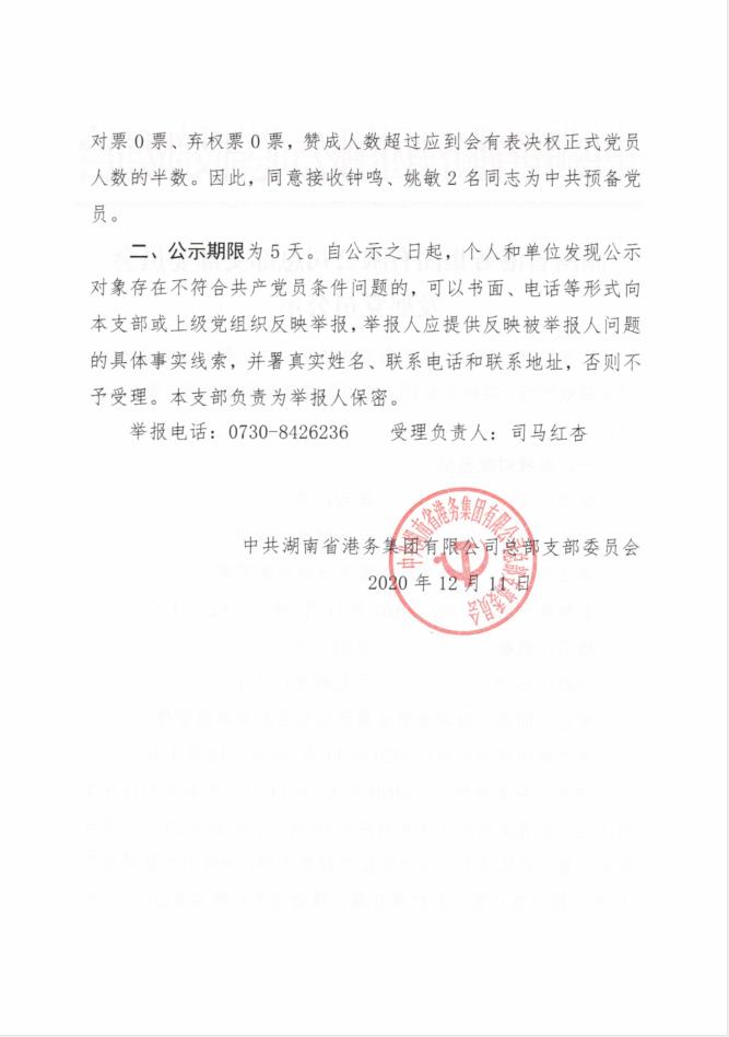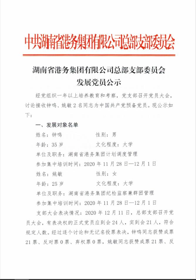 湖南省港务集团有限公司总部支部委员会发展党员公示